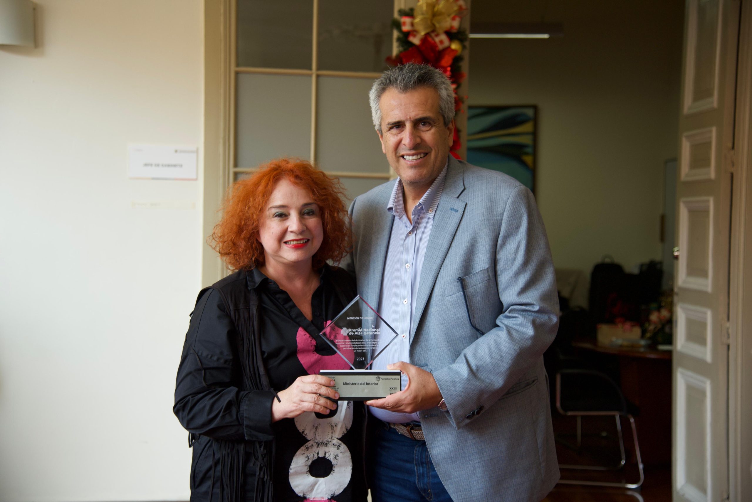 Bogotá, diciembre 20 de 2023. (@MinInterior)-. El Ministerio del Interior en cabeza de Luis Fernando Velasco, recibió la mención honorífica por la Política para el Diálogo Social desde y para los Territorios, en el marco del Premio Nacional de Alta Gerencia que realiza el Departamento Administrativo de la Función Pública (DAFP), como reconocimiento a la labor de la Entidad por generar espacios de fortalecimiento institucional y de participación ciudadana para construir un mejor país.